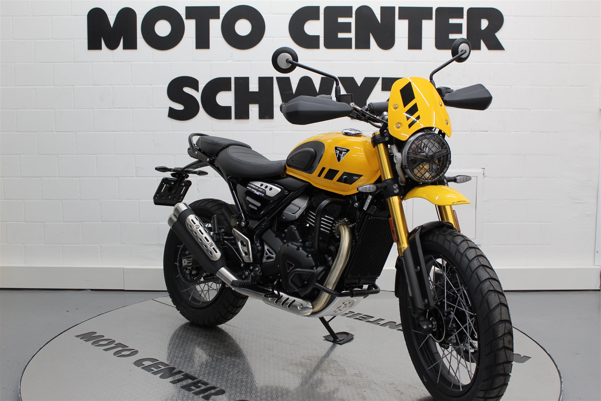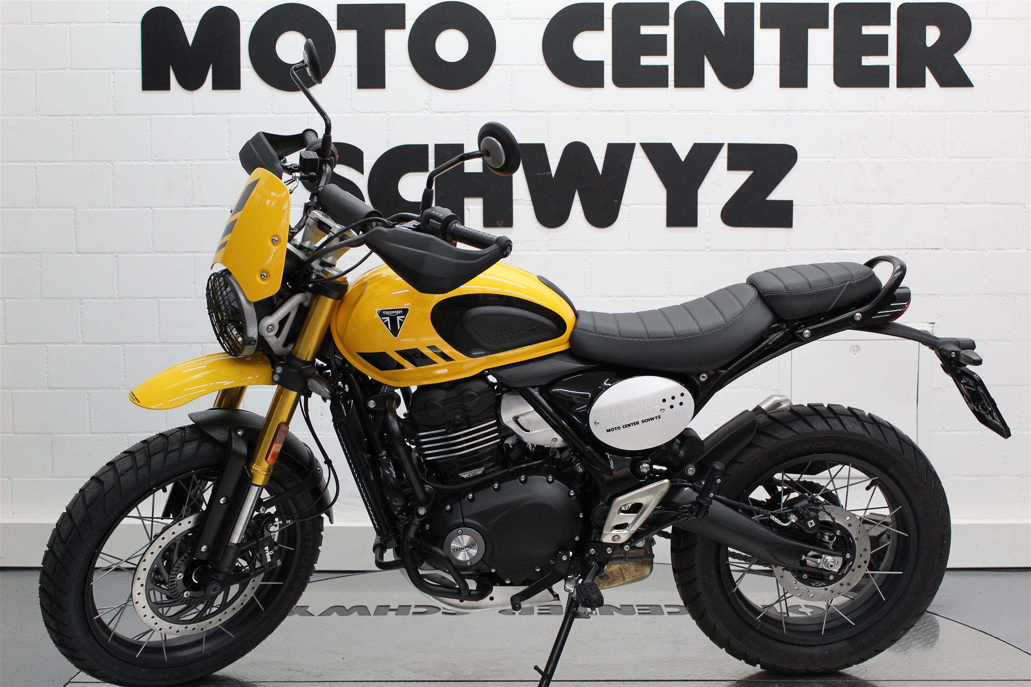 Die neue Scrambler 400 XC, nun mit Speichenrad, Unterfahrschutz, Sturzbügel, hoher Spritzschutz sowie Windschutzscheibe. Die TC ist ausschaltbar und mit dem passenden Offroad ABS ist der Spassfaktor garantiert.
